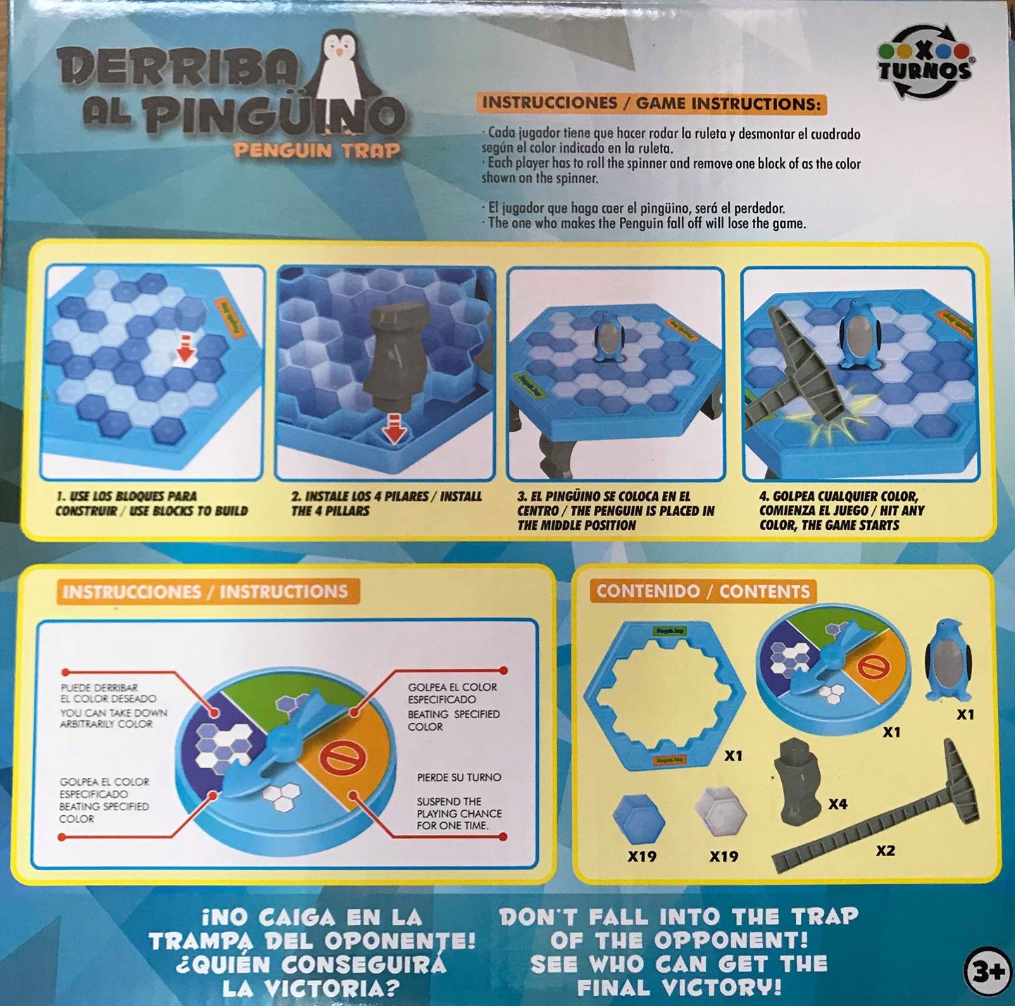 –Si el pingüino cae de pie sobre su bloque, el jugador que lo ha derribado gana la partida.